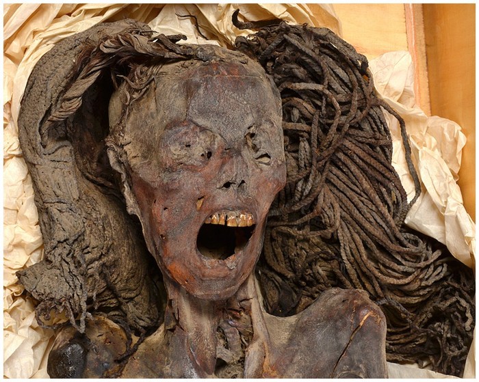Mumi menjerit: Beberapa mumi telah ditemukan di Mesir, tapi tidak semuanya telah diidentifikasi. Salah satu mumi yang diisebut sebagai Unknown Man E, dikenal karena satu ciri khasnya, mulutnya seperti menjerit atau berteriak. Dapat diasumsikan bahwa siapa pun itu, dulu meninggal dalam penderitaan. Diduga mumi itu bisa jadi Pentawer, seorang pangeran yang berencana membunuh ayahnya sendiri, dan dipaksa bunuh diri setelah diadili.Β Foto: Dokumentasi Ahli Radiologi Sahar Saleem dari Universitas Kairo, Jurnal Frontier in Medicine