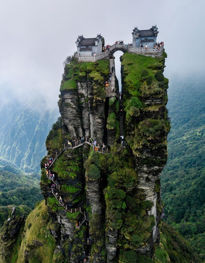 Kuil Fanjingshan, China Berlokasi di Pegunungan Wuling, kuil Buddha kuno ini punya ubin besi untuk menahan angin kencang, tampak hampir tidak nyata. Mencapai ke sana, kamu perlu melakukan pendakian empat jam lebih dari 8.000 langkah. Foto: Boredpanda