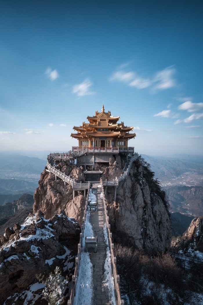 Kuil Emas Gunung Laojun, Cina Paviliunnya dengan atap emas yang dicat terletak di atas salah satu puncak Gunung Laojun, yang tertinggi di Pegunungan Funiu pada 2217 meter. Foto: Boredpanda