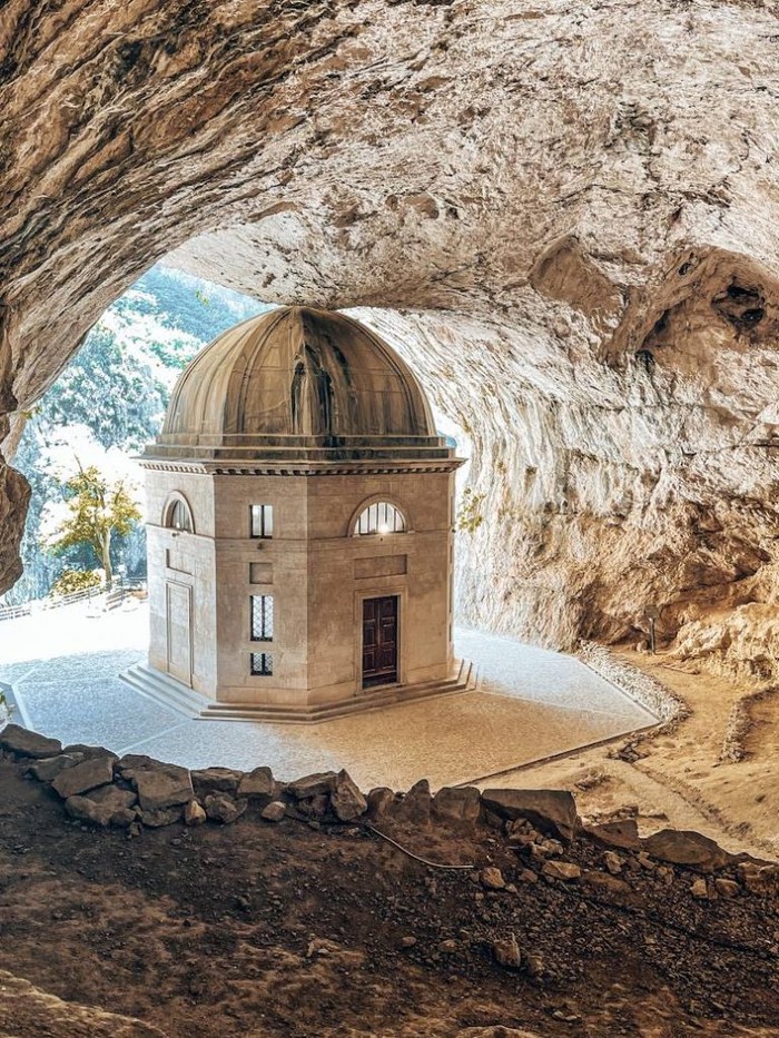 Kuil Valadier, Italia Terletak di pintu masuk Gua Frasassi, tempat suci kuno ini, pertama kali disebutkan dalam dokumen dari tahun 1029, adalah struktur batu sederhana yang dibangun oleh para biarawan Benediktin untuk menampung gambar Madonna yang dihormati. Foto: Boredpanda