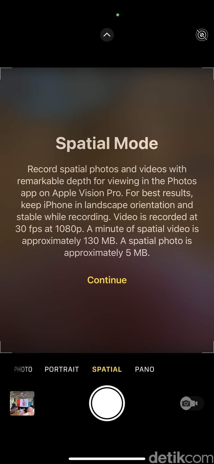 Apple menambahkan mode Spatial pada aplikasi kamera. Tidak hanya bisa merekam video, kita pun dapat memotret foto dan beralih antara keduanya dengan mudah. Foto: Adi Fida Rahman/detikINET