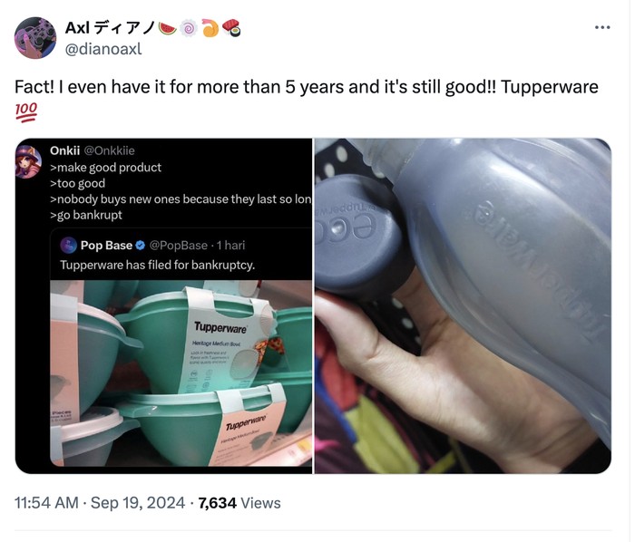 Menurut akun ini, Tupperware bangkrut karena membuat produk yang sangat awet sehingga tak perlu membeli lagi dan ibu-ibu menjaga setengah mati Tupperware miliknya. Foto: X.com