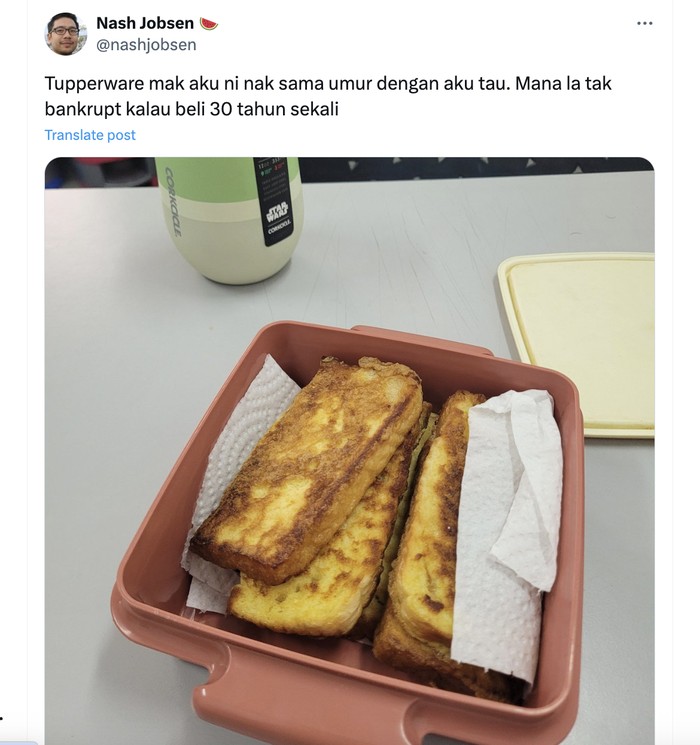 Tapi tidak ada yang membantah keawetan produk Tupperware. "Tupperware ibuku nih sama dengan umurku. Gimana gak bangkrut kalau belinya 30 tahun sekali," tulisnya. Foto: X.com