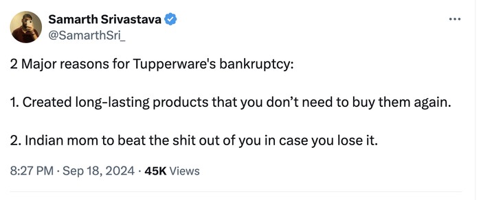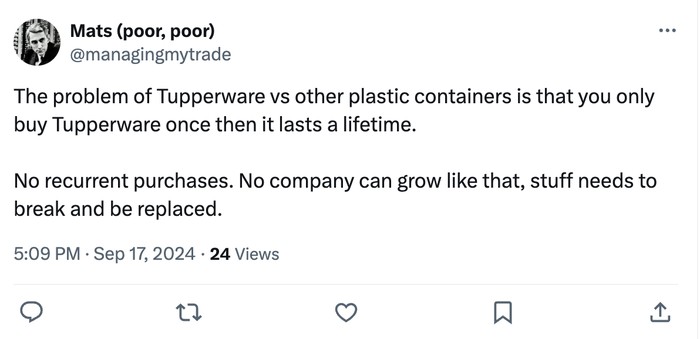 Masalah pada Tuppwerware adalah Anda hanya membelinya sekali seumur hidup. Tidak ada perusahaan bisa bertahan dengan cara seperti itu. Foto: X.com