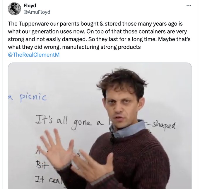 "Tupperware yang dibeli orang tua kita adalah apa yang dipakai generasi kita. Produk itu sangat kuat dan tidak mudah rusak. Mungkin itulah salah mereka, membuat produk yang kuat," tulis akun ini. Foto: X.com