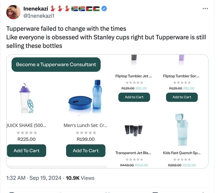 Menurut akun ini, Tupperware gagal mengikuti perkembangan zaman. Orang sudah terobsesi merek baru seperti Stanley dan Tupperware juga dirasa mahal. Foto: X.com