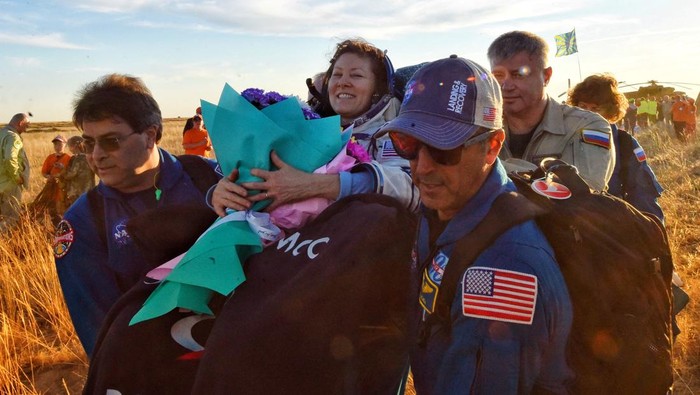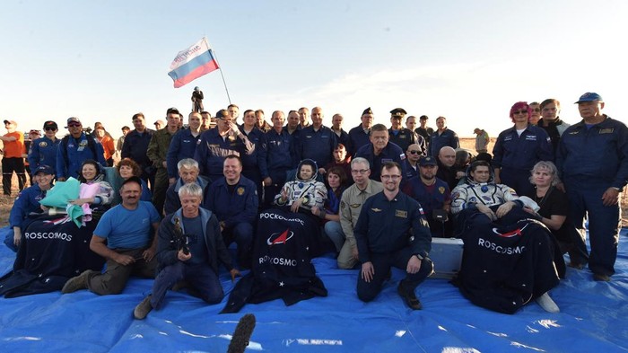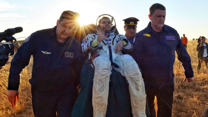 Oleg Kononenko dan Nikolai Chub kembali setelah tinggal selama 374 hari di stasiun antariksa itu. Pada hari Jumat lalu mereka memecahkan rekor tinggal paling lama di sana.Β Β