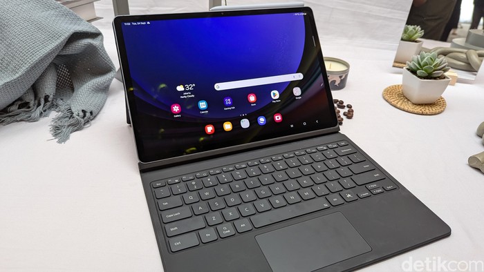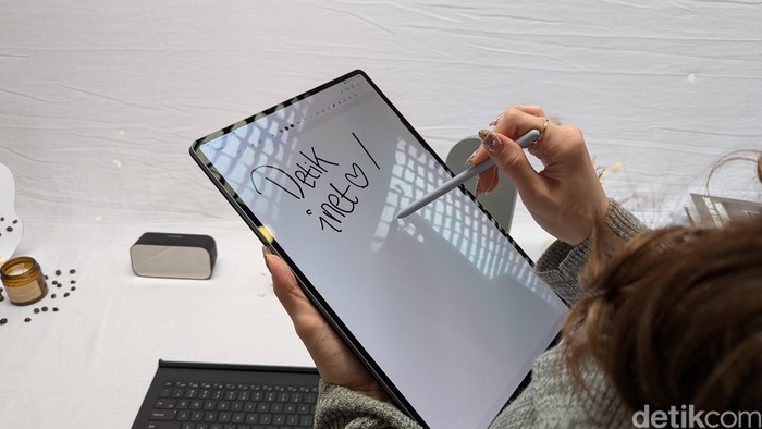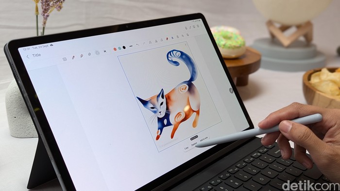 Galaxy Tab S10+ dan Tab S10 Ultra sudah sepaket dengan stylus S Pen dan Book Cover Keyboard. S Pen di Galaxy Tab S10 series sudah dioptimalkan untuk beberapa fitur Galaxy AI. Foto: Virgina Maulita Putri/detikINET
