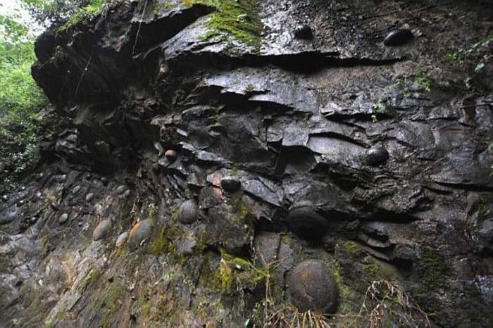 Menurut penduduk setempat, 'tebing bertelur' yang terletak di tenggara China ini secara berkala menghasilkan batu-batu bulat besar yang beratnya mencapai 300 kg. Konon, telur batu itu akan jatuh dari tebing setiap tiga dekade atau lebih. Foto: via Geologyn