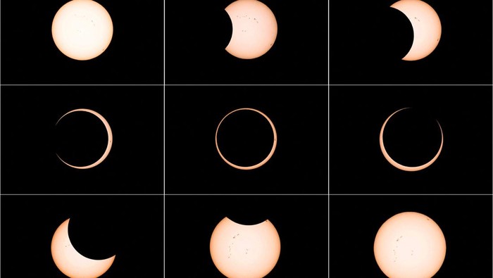 Gerhana matahari cincin ini terjadi saat bulan melintas di antara matahari dan bumi, ketika berada pada titik terjauhnya dari bumi. Sebelum dan sesudah matahari muncul sebagai cincin api, pengamat akan melihat sebagian dari matahari terhalang, sehingga membentuk bulan sabit. (AP Photo/Esteban Felix)