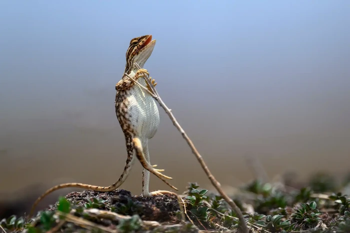 Kadal bertenggorokan kipas hanya ditemukan di anak benua India, di mana mereka telah berevolusi di bawah pengaruh perubahan iklim. Kadal betina tidak memiliki kipas, sementara kadal jantan mengembang kantong leher mereka untuk menarik betina di musim panas. Inilah betina, berdiri tegak untuk menghindari panasnya musim panas karya: Sanjay Patil Foto: Nikon Comedy Wildlife Awards