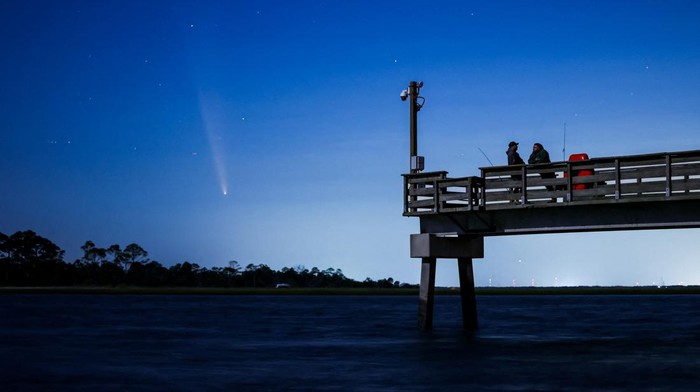 Komet C/2023 A3 (Tsuchinshan-ATLAS) dengan orbit 80.000 tahun, terlihat sesaat setelah matahari terbenam di langit barat di atas Dermaga Fisherman’s Walk saat dua orang pria memancing di Pulau Tybee, Georgia, Amerika Serikat, Minggu (13/10/2024). (REUTERS/Sam Wolfe)