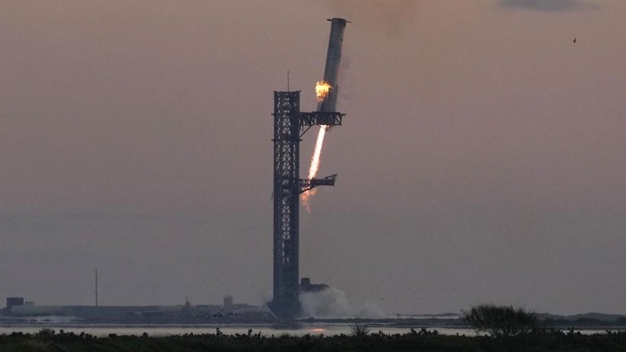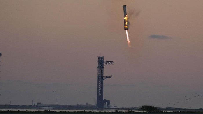 Bagaimana tidak, lengan 'sumpit' di menara peluncuran yang disebut sebagai Mechazilla oleh Elon Musk, berhasil menangkap pendorong tahap pertama atau booster Starship yang kembali setelah uji terbang. Manuver inovatif ini merupakan tonggak penting dalam upaya SpaceX menggunakan kembali roket itu secara cepat.Β AP/Eric Gay Β