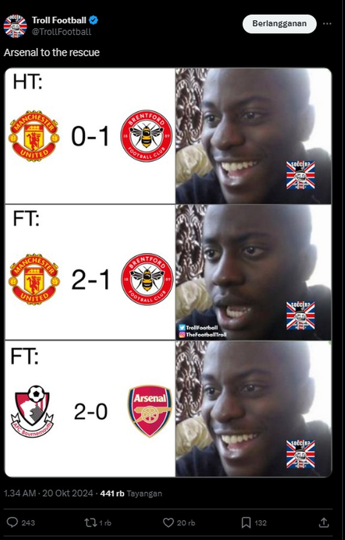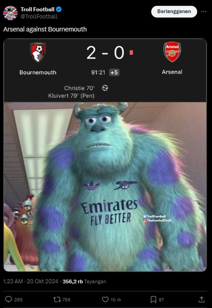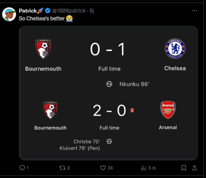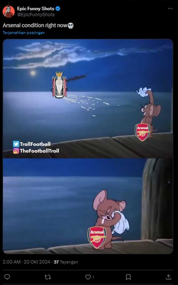 Tentu saja kekalahan Arsenal menjadi beritaΒ yang dinantiΒ bagi para penggemar dari klub lain. Foto: (Twitter).