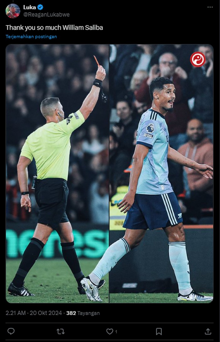 Ya, pemain yang terkena kartu merah semalam ialah William Saliba. Foto: (Twitter).