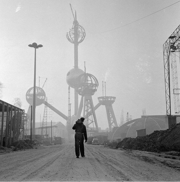 Pembangunan Atomium di Brussels untuk Pameran Dunia tahun 1958. Foto oleh Dolf Kruger. Foto: History Pics/X.com