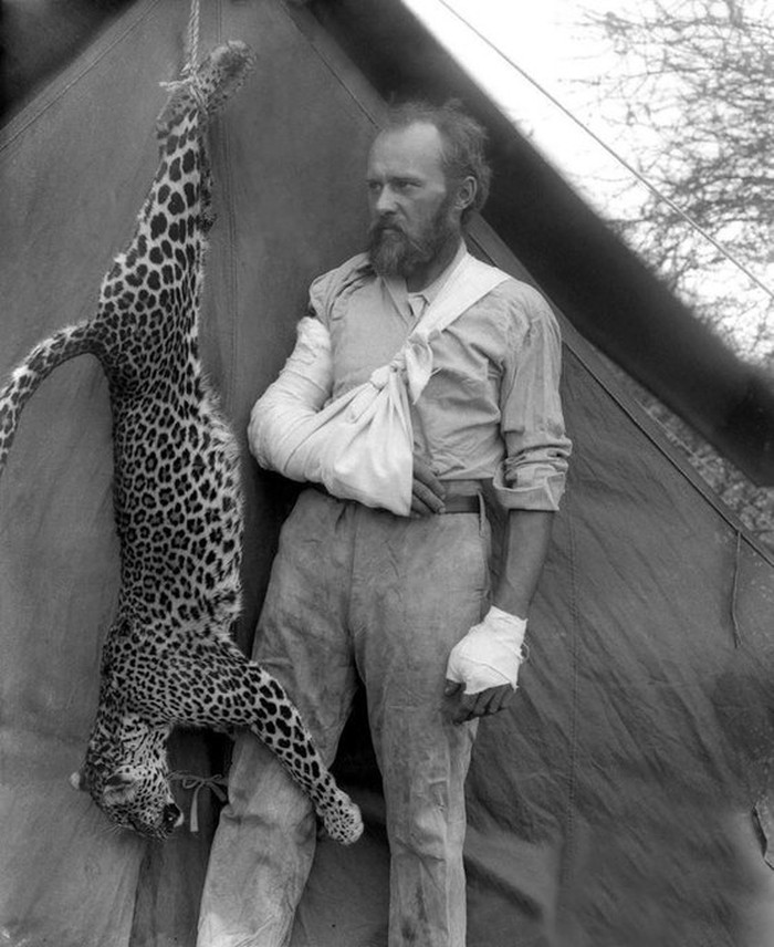 Konservasionis dan ahli taksidermis Carl Akeley berpose, lengan dan tangannya dibalut, di samping macan tutul yang dia bunuh dengan tangan kosong, Ethiopia, 1896. Foto melalui Perpustakaan Museum Lapangan. Foto: History Pics/X.com