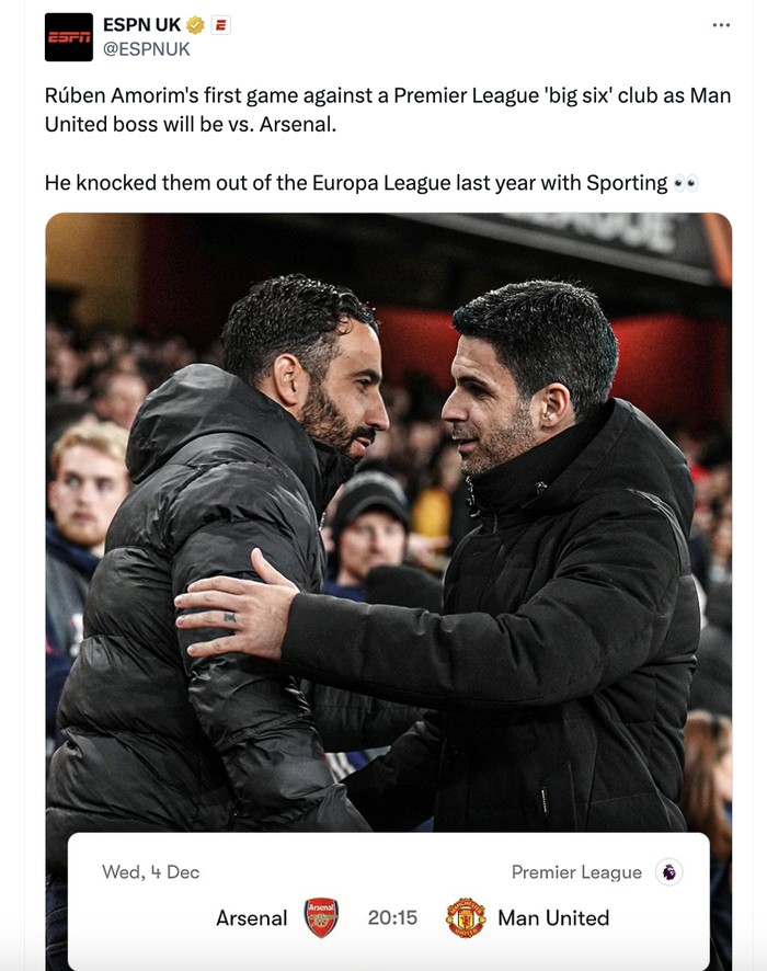 Lawan berat pertama Amorim di MU adalah melawan Arsenal. Foto: X.com