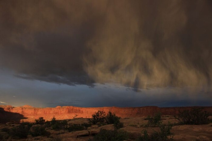 "Matahari sore menerobos celah awan dan menerangi tebing Wingate dan Navajo di atas Dirty Devil River melalui 'renda' virga," kata Wells Shoemaker dari Burr Point, Utah, AS yang mengambil foto ini pada 22 April 2019. Foto: Wells Shoemaker via Earth Sky
