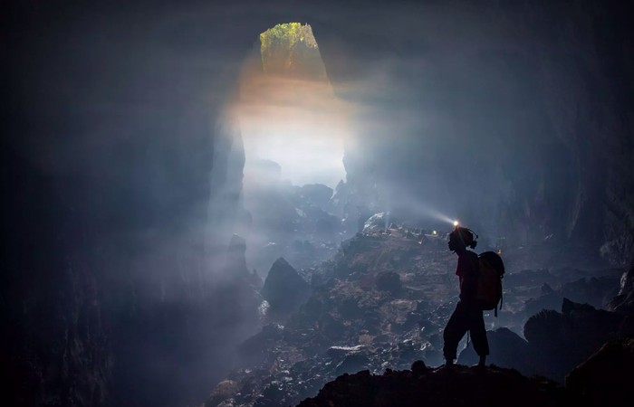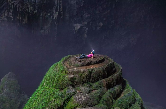Fotografer Australia John Spies mengabadikan pemandangan Hang Son Doong dalam sebuah ekspedisi menjelajahi gua tersebut di 2014. Foto ini memperlihatkan seorang pria dengan topi yang dilengkapi senter membuat bayangan kecil saat dia berdiri di tengah luasnya gua tersebut. Foto: John Spies via Mirror