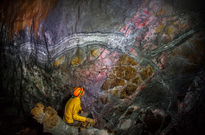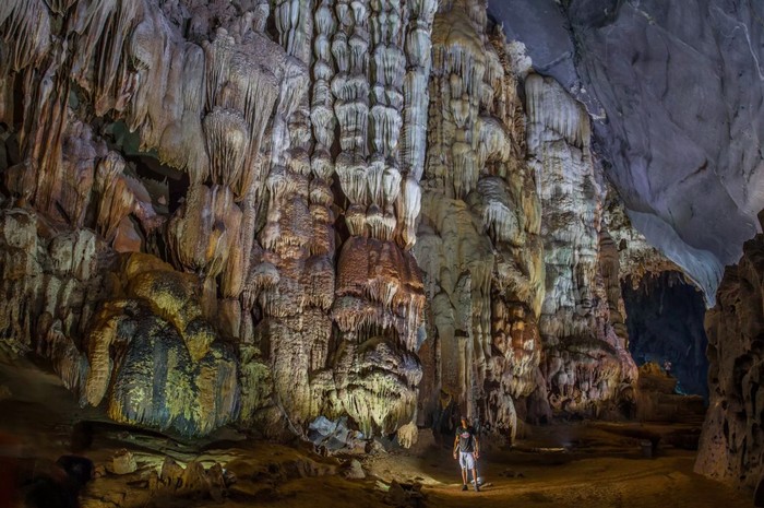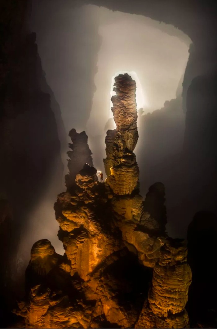 Dari foto ini dapat dilihat bagaimana perbandingan ukuran salah satu formasi di gua tersebut sangat besar dibandingkan dengan sosok manusia. Foto: John Spies via Mirror