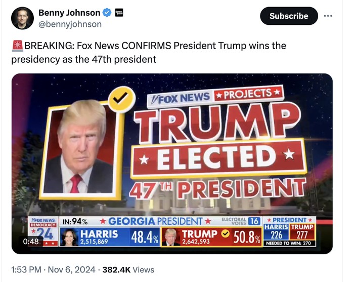 Media Fox News sudah mengumumkan kemenangan Trump. Foto: X.com