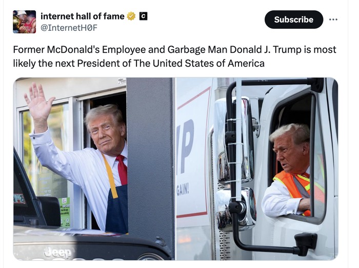 Akun ini bercanda bahwa mantan pegawai McDonalds dan sopir truk sampah kemungkinan besar menjadi Presiden AS selanjutnya. Dalam masa kampanye, Trump memang sempat mencoba dua profesi itu. Foto: X.com