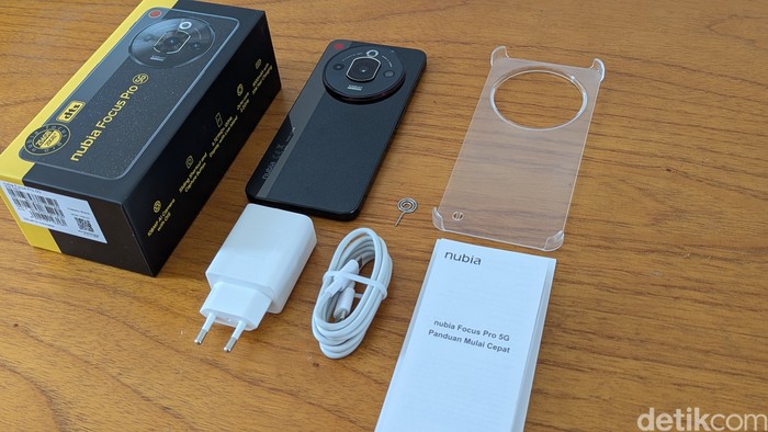 Isi paket penjualannya cukup standar, ada unit Nubia Focus Pro 5G, charger, kabel USB-C ke USB-C, ejector pin, case bening, dan buku panduan. Foto: Virgina Maulita Putri/detikINET