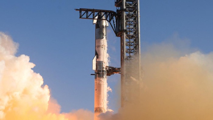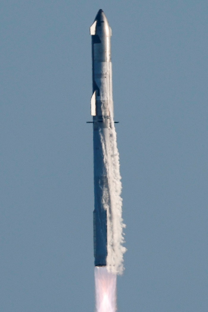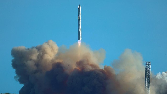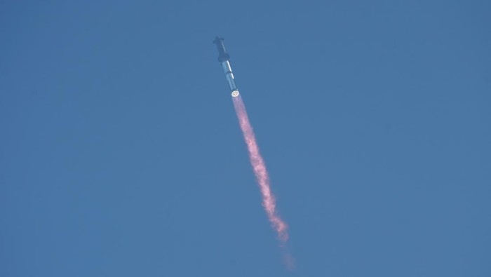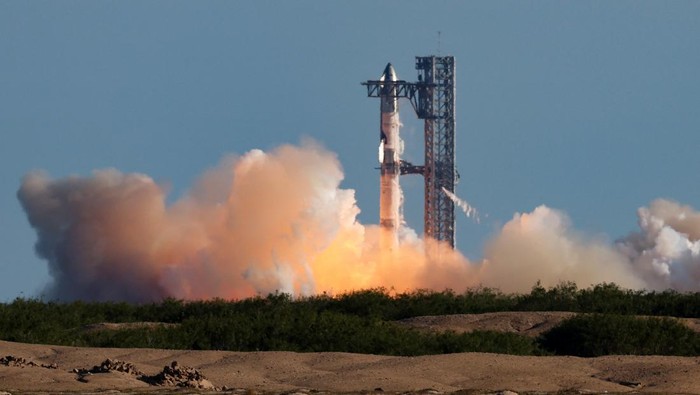 Roket tersebut lepas landas dari fasilitas "Starbase" milik SpaceX di dekat Brownsville, Texas. Tidak ada seorang pun di dalam pesawat Starship tersebut. (REUTERS/Joe Skipper)