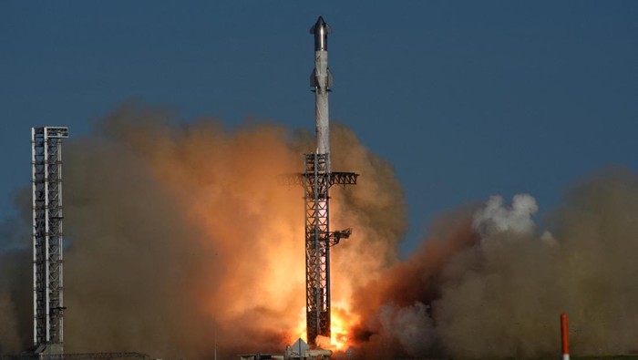 SpaceX bermaksud untuk mengembalikan pendorong roket "Super Heavy" setelah terpisah dari Starship dan mendaratkannya di lengan menara peluncuran milik perusahaan. Namun, SpaceX mengatakan selama webcast-nya bahwa pendorong roket tidak memenuhi "kriteria komitmen" yang diperlukan untuk upaya penangkapan, jadi pendorong roket tersebut malah mendarat di Teluk Meksiko. (REUTERS/Joe Skipper)