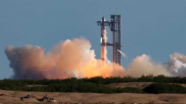 SpaceX meluncurkan uji terbang keenam roket Starship miliknya di landasan peluncuran Boca Chica milik perusahaan di Brownsville, Texas, Amerika Serikat, Selasa (19/11/2024). (REUTERS/Joe Skipper)
