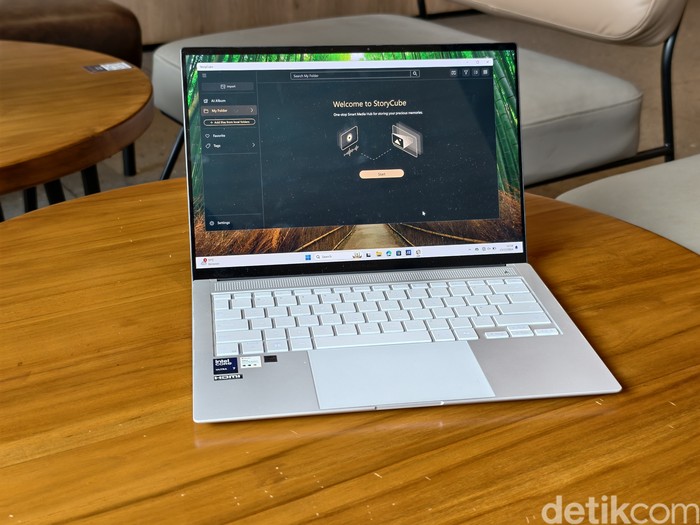 Kita bisa membuka bagian atasnya dengan satu tangan. Laptop ini mengintegrasikan sistem keamanan Microsoft Pluton yang mampu melindungi data dari ancaman siber dengan menggabungkan lapisan keamanan perangkat keras dan perangkat lunak. Selain itu, fitur Windows Hello dengan kamera IR AiSense memungkinkan login wajah yang aman dan cepat. Foto: Adi Fida Rahman/detikINET