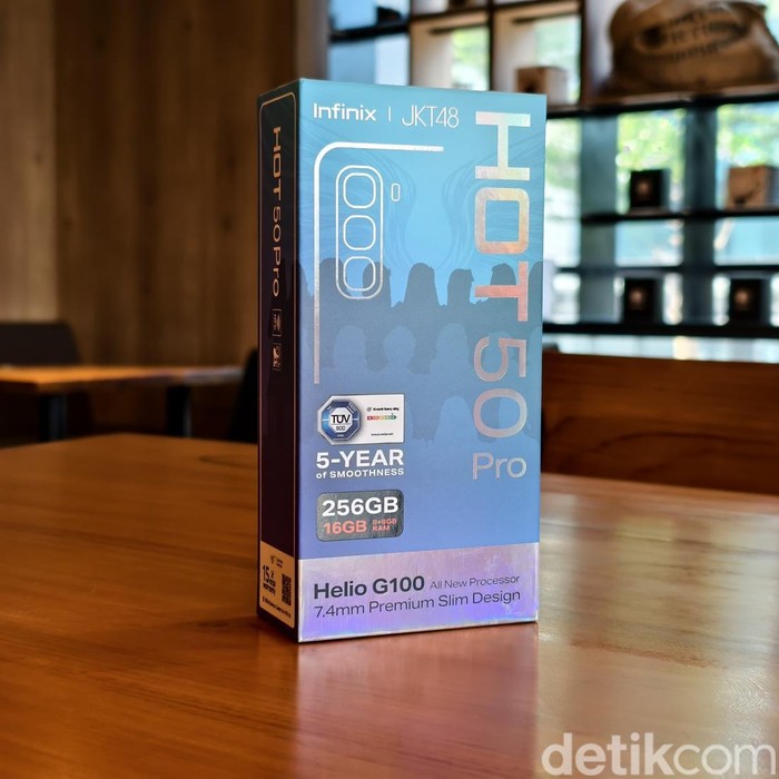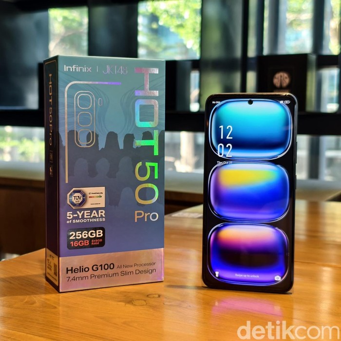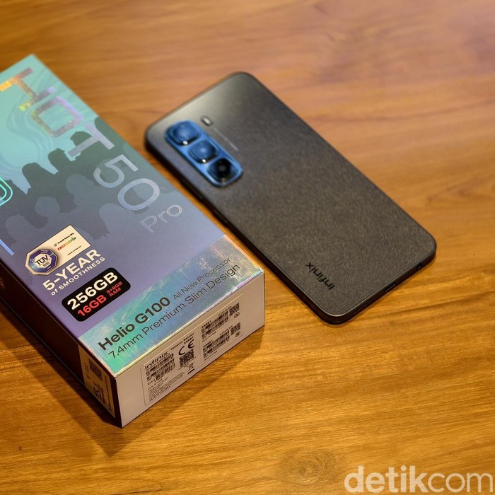 Infinix Hot 50 Pro disokong chip MediaTek Helio G100 HP ini mengantongi sertifikat TΓV SΓD 60-Month Fluency yang menjamin performa perangkat tetap mulus hingga lima tahun. Infinix mengklaim Hot 50 Pro menjadi seri smartphone pertama di industri yang mendapatkan sertifikasi tersebut, menjadikannya pilihan terbaik bagi konsumen yang mengutamakan keandalan jangka panjang Foto: Adi Fida Rahman/detikINET