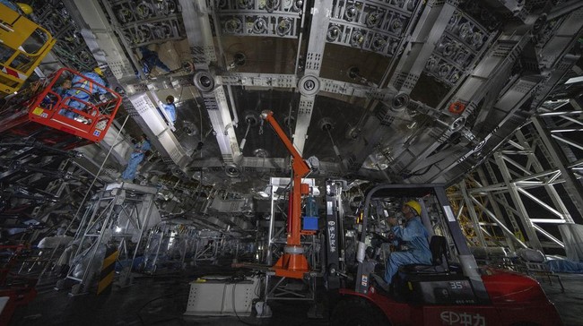 Para pekerja bekerja di bagian bawah detektor kosmik yang terletak 2.297 kaki (700 meter) di bawah tanah di Observatorium Neutrino Bawah Tanah Jiangmen di Kaiping, provinsi Guangdong, China selatan. Detektor neutrino baru di China bertujuan untuk menemukan partikel hantu misterius yang mengintai di sekitar kita.