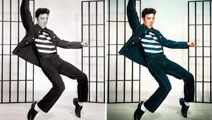 Foto legendaris Elvis Presley di video klip lagu Jailhouse Rock dibuat jadi berwarna. Foto: Boredpanda