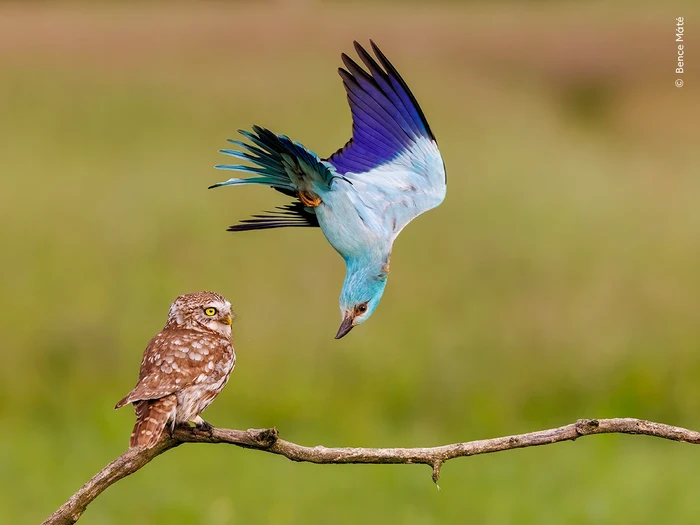 Seekor roller Eropa mempertahankan wilayahnya dari burung hantu kecil yang tampak bingung di Taman Nasional KiskunsΓ‘g, Hongaria. Karya Bence MΓ‘tΓ© Foto: Wildlife Photographer of the Year