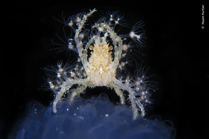 Seekor kepiting dekorator bertengger di atas air laut untuk menyisir air untuk plankton yang melayang. Noam mengambil foto ini saat menyelam di malam hari di lepas pulau Komodo, Indonesia. Semprotan laut memberi kepiting tahap yang sempurna untuk memakan plankton yang melayang. Kepiting itu telah menyamar dan mempersenjatai dirinya dengan hidroid kecil yang dikenal sebagai Tubularia. Ini dapat menyengat hewan lain dan membantu melindungi kepiting dari predator.Noam melihat kepiting dengan anggun mencari makanan, diterangi oleh lampu kilat kamera seolah-olah berada di tengah panggung sorotan. Karya Noam Kortler Foto: Wildlife Photographer of the Year