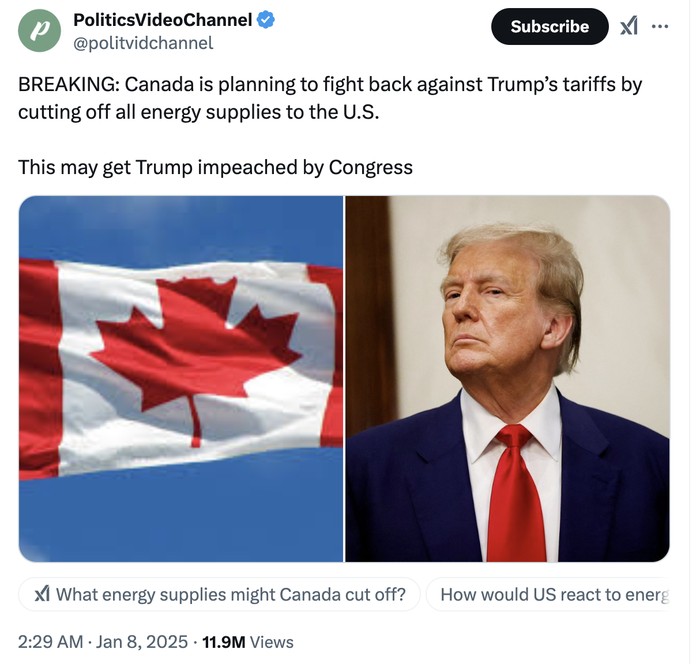 Kanada sepertinya ingin membalas ancaman tarif impor Trump dengan memotong suplai energi ke AS. Foto: X.com
