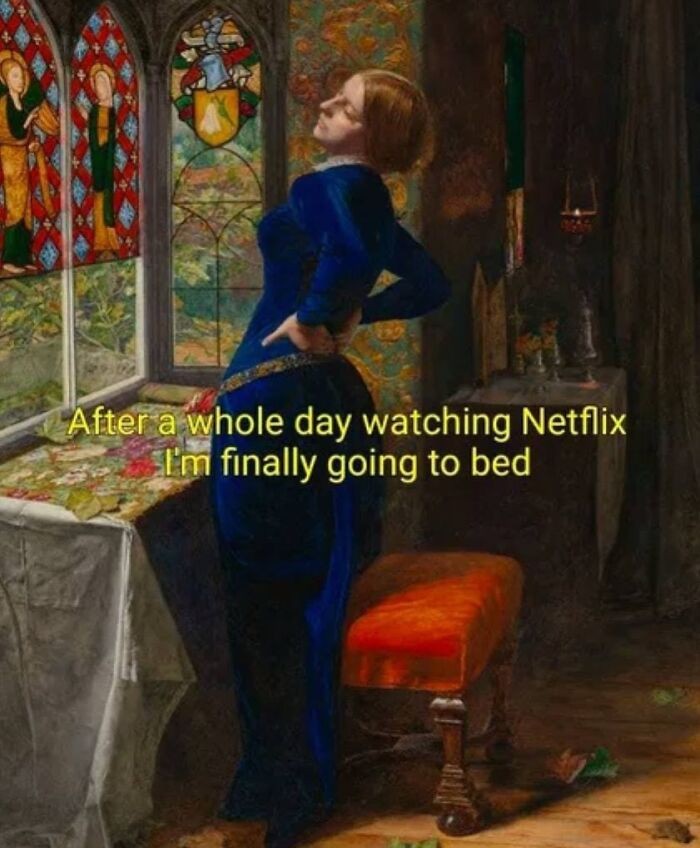 Biasanya yang lagi libur, semua agenda mulai bebenah rumah sampai olahraga, langsung buyar begitu terdistraksi Netflix. Foto: Classical AF Instagram via Bored Panda
