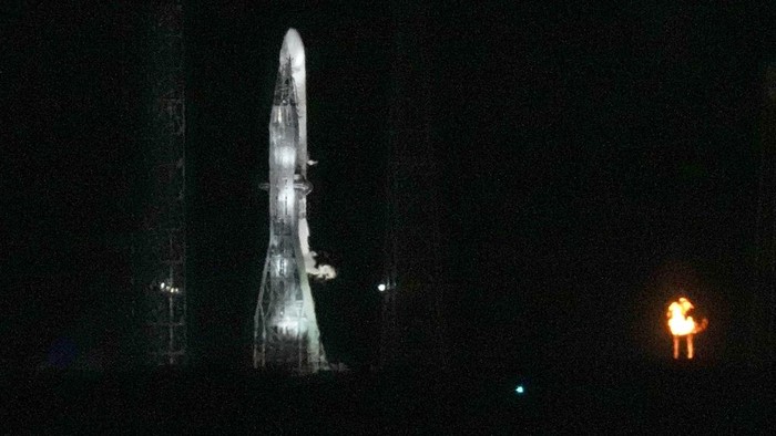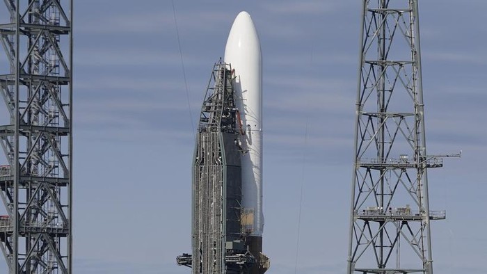 Roket New Glenn milik Blue Origin terlihat di Kompleks Peluncuran 36 sesaat sebelum upaya peluncuran dibatalkan di Stasiun Angkatan Luar Angkasa Cape Canaveral, Florida, Senin (13/1/2025). Β