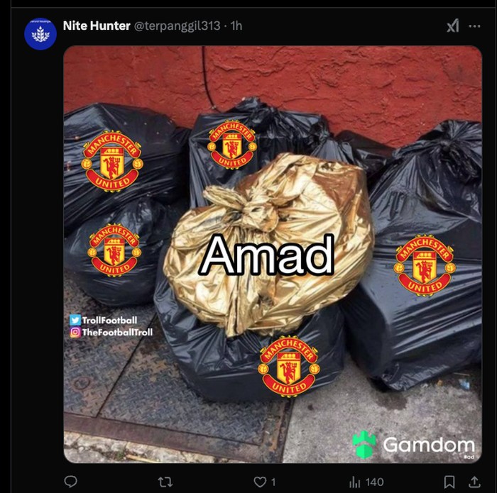Hattrick Amad Diallo mengantarkan kemenangan bagi MU. Menjadikannya pemain Setan Merah pertama yang cetak hattrick setelah Ronaldo di 2022.Β Foto: X.com