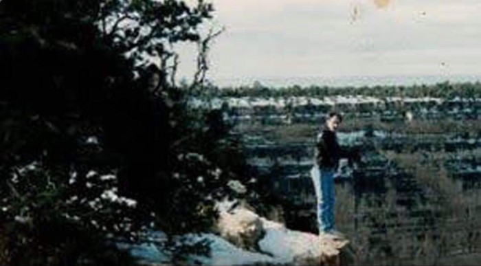 Foto seorang pria yang berdiri di tepi Grand Canyon ini berasal dari tahun 1970-an. Di belakangnya mengintai sosok menakutkan, menatap langsung ke kamera. Pria tersebut dan teman-temannya mengaku bahwa mereka telah berada di tempat itu selama lebih dari 15 menit, dan tidak pernah memperhatikan pria tersebut di sana. Foto: Boredpanda
