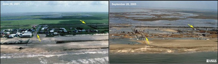 Kondisi Holly Beach di Lousiana sebelum dan sesudah diterjang badai Rita pada 2005. Foto: USGS.