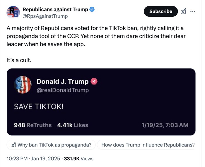 Padahal mayoritas Partai Republik voting melarang TikTok karena dianggap alat propaganda China. Namun kini mereka diam saja di saat Trump memulihkan TikTok. Foto: X.com