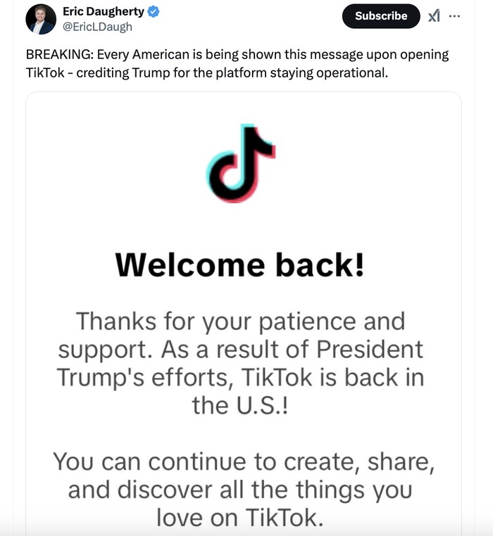 "Karena usaha Trump, TikTok kembali di AS," demikian bunyi pesan dari TikTok. Foto: X.com