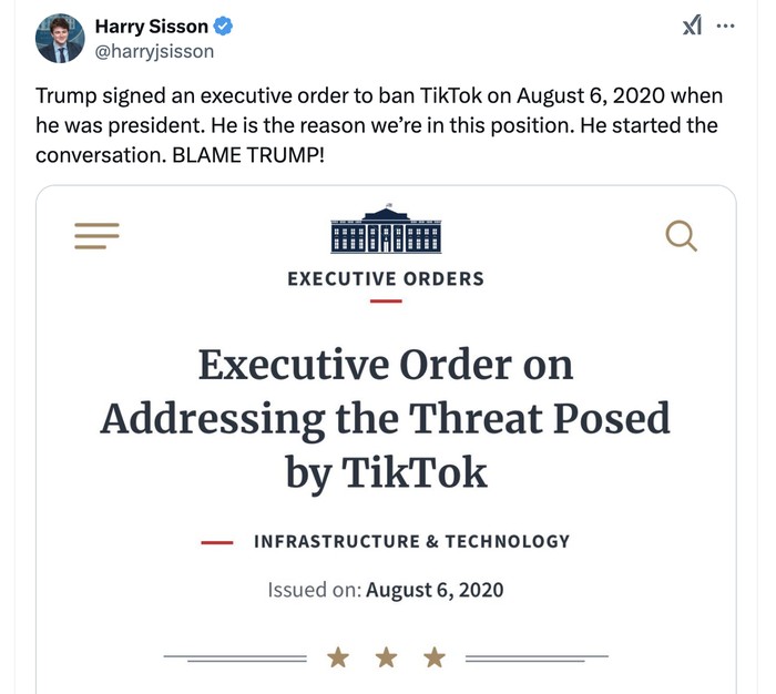 Padahal Trump yang sebenarnya mengawali inisiatif untuk memblokir TikTok di AS. "Trump menandatangani perintak eksekutif melarang TikTok pada 6 Agustus 2020 saat dia presiden," sebut akun ini. Foto: X.com
