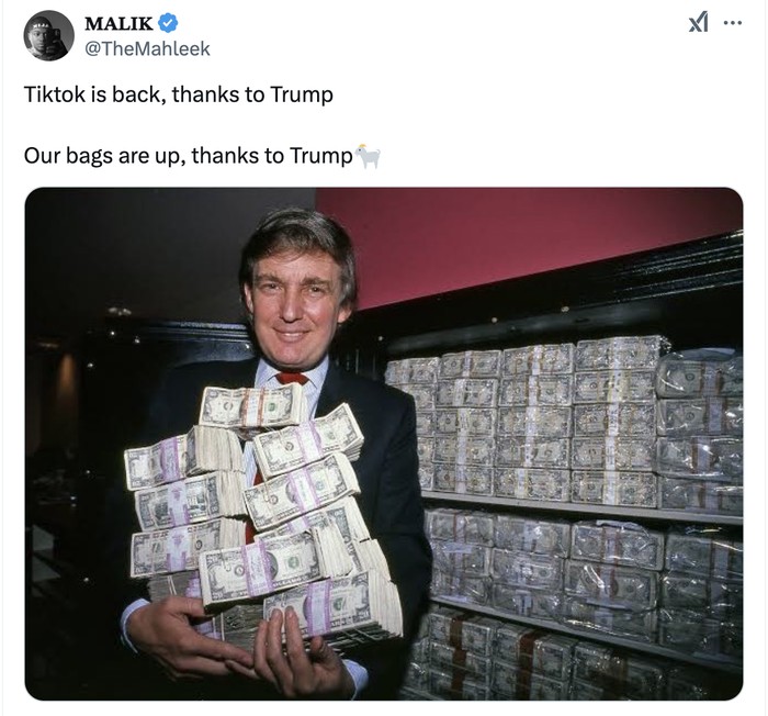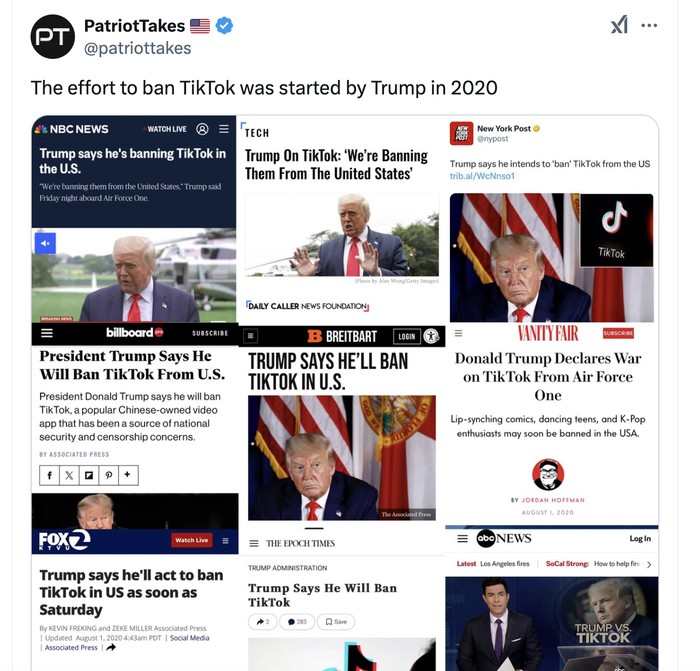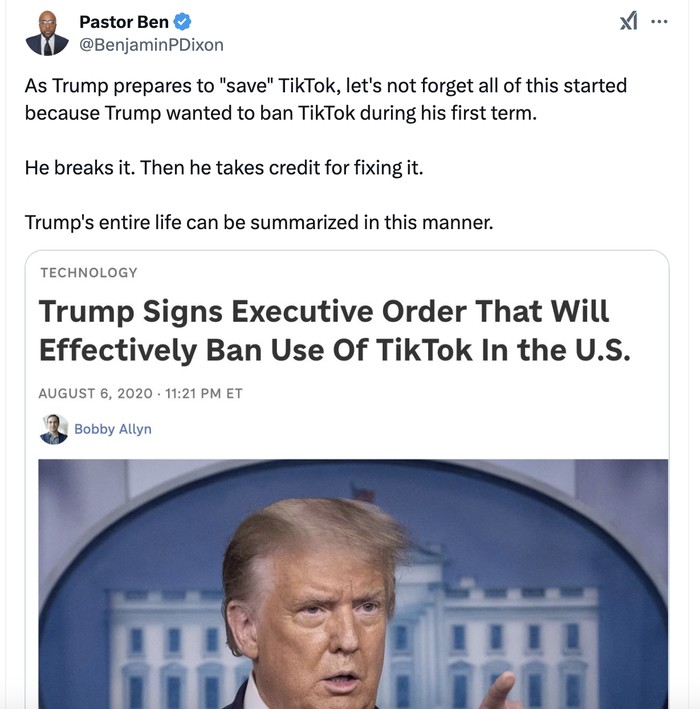 "Jangan lupa semua ini dimulai karena Trump ingin melarang TikTok. Kini dia mengambil pujian karena menyelamatkannya," sebut netizen ini. Foto: X.com