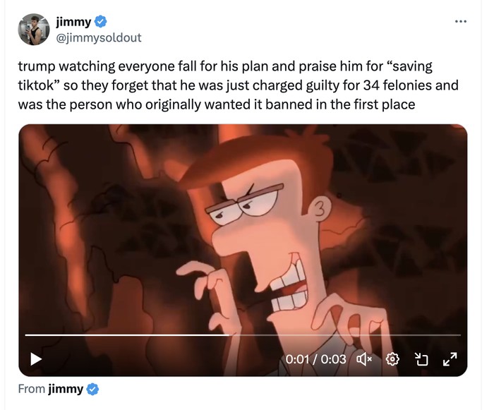 Akun ini menilai Trump mengalihkan perhatian orang dari kasus kriminalnya dengan menyelamatkan TikTok. Foto: X.com