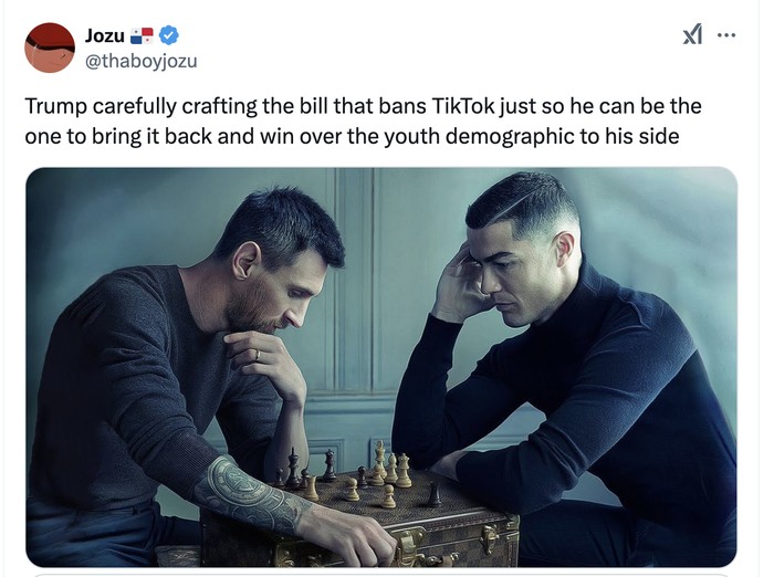 "Trump merancang peraturan melarang TikTok sehingga dia bisa membawanya kembali hidup dan menarik kaum muda," sebut akun ini. Foto: X.com