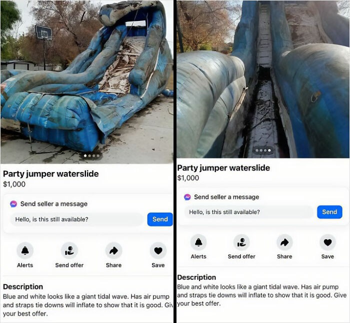 FotoINET Sederet Barang Aneh yang Dijual di Internet, Kamu Tertarik Beli? Bored Panda - detikInet Minggu, 26 Jan 2025 15:15 WIB Tautan telah disalin Jakarta - Ada saja barang aneh yang dijual orang-orang di internet. Kamu tertarik beli nggak nih? Yuk intip daftarnya berikut. Mungkin yang jual mikirnya siapa tau ada yang butuh. Foto: (Bored Panda). Elon Musk pasti tertawa melihat ini. Foto: (Bored Panda). Kok bisa kepikiran jual perosotan yang sudah rusak parah seperti ini. Foto: (Bored Panda). Mungkin ada yang butuh slimut buat closet-nya. Takutnya closetnya kedinginan. Foto: (Bored Panda). Kurang bunga mawarnya sih. Foto: (Bored Panda). Biar apa coba dikasih kasat berduri. Foto: (Bored Panda). Oh celana jeans yang tadi sisaan buat bikin sofa kali ya. Foto: (Bored Panda). Khusus untuk penggemar berat Patrick Star. Foto: (Bored Panda). Tapi kayaknya itu telur bohongan ya. Foto: (Bored Panda). Kok bisa kepikiran jual sisa makanan. Foto: (Bored Panda). Yuk yang mau kustomisasi kue ulang tahun. Foto: (Bored Panda). Kirain celana, ternyata meja guys. Foto: (Bored Panda). Ini unik sih. Foto: (Bored Panda). Jauh dari kata mirip. Foto: (Bored Panda). Ada yang spaghetti nggak ya. Foto: (Bored Panda). (/) TAGS fotoinet foto lucu foto aneh LIHAT LAINNYA Tautan telah disalin